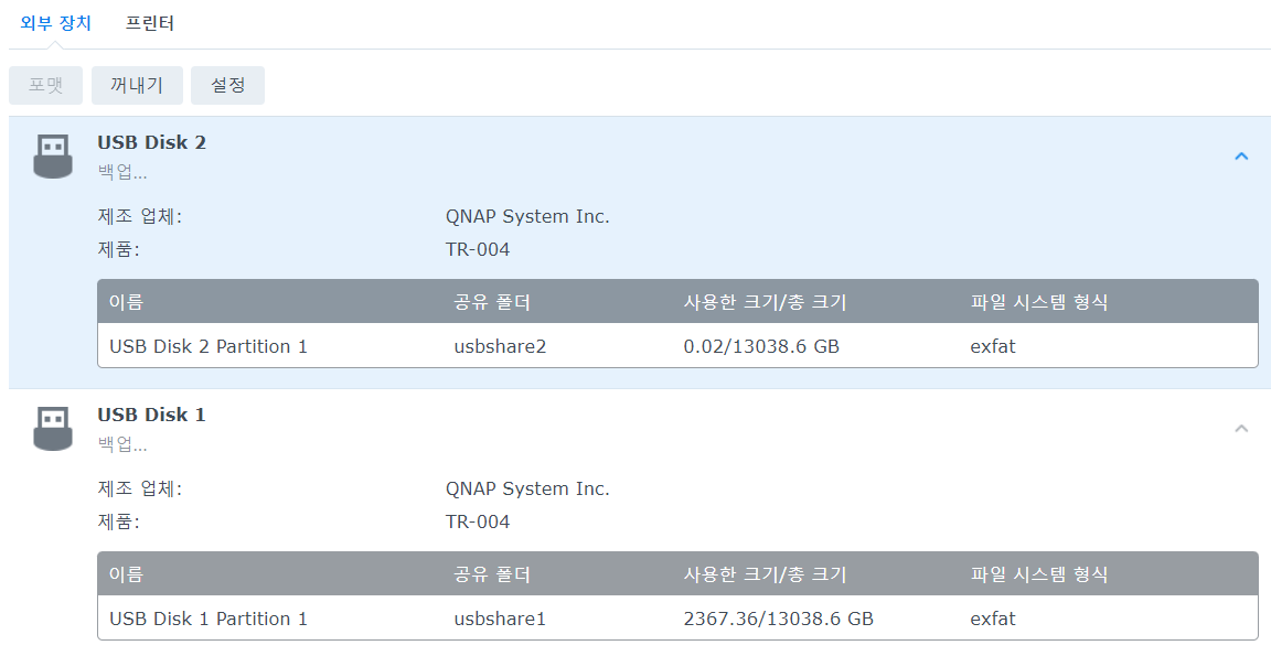 USB Disk 1/2로 개별적으로 잘 인식되는 모습입니다.
