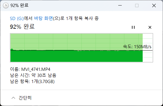 실제 미러리스에서 녹화된 4K 30fps 50GB 단일 동영상 파일을 이동한 결과는