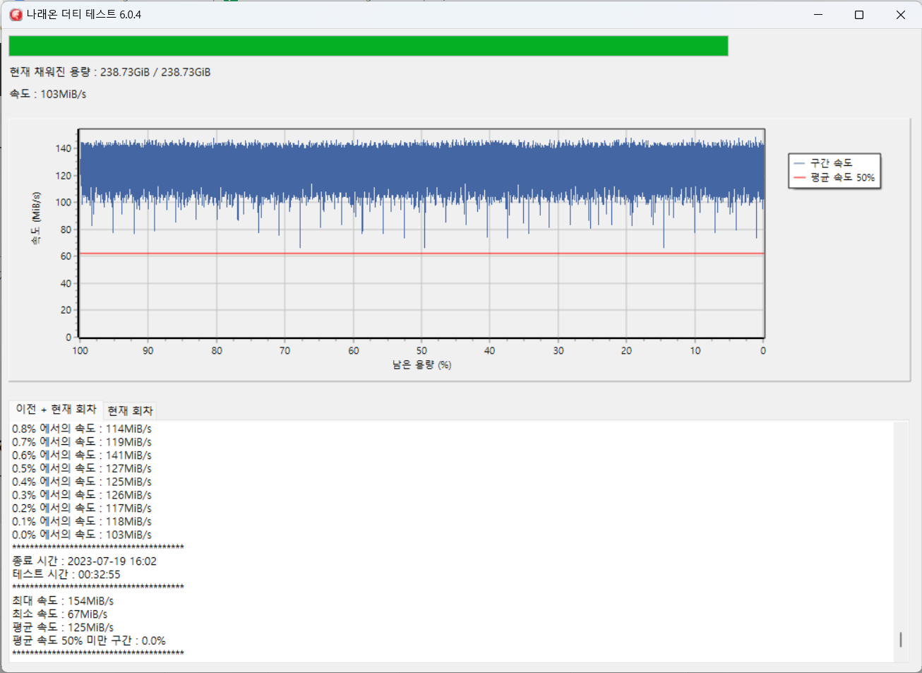 256GB 전체를 1회 채우는데 32분 55초가 소요되었습니다.
