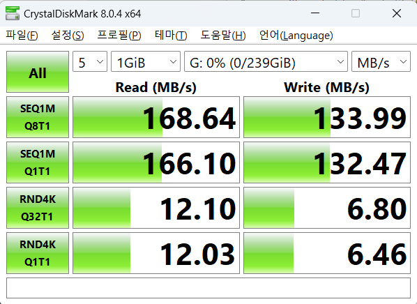 리더기 최대 스펙 170MB/s에 근접하는 순차 기준 읽기 168MB/s, 쓰기 133MB/s 가 나왔습니다.