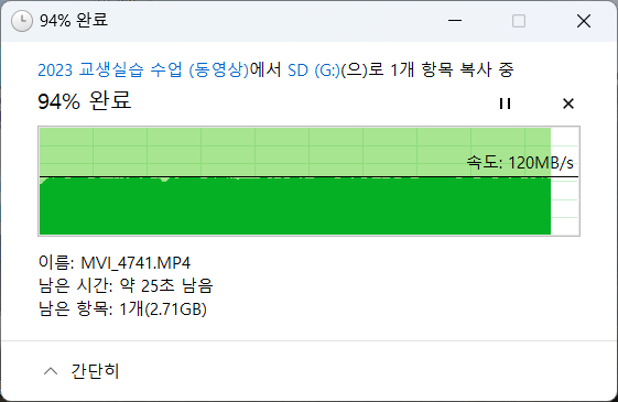 실제 미러리스에서 녹화된 4K 30fps 50GB 단일 동영상 파일을 이동한 결과는