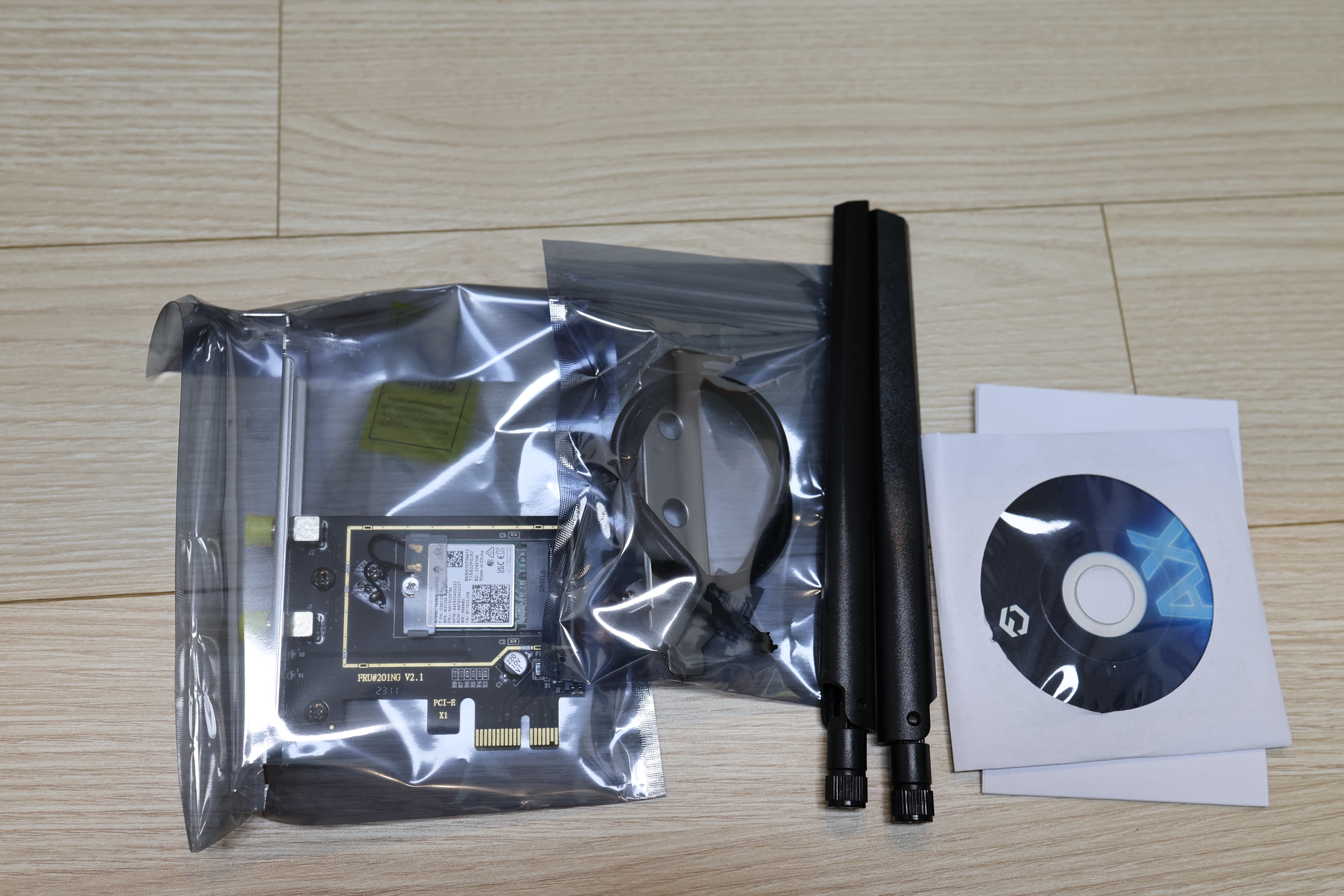 2만 원대에 AX210 칩셋과 PCIE 데스크톱 변환 카드, LP 브래킷, 드라이버 CD, 안테나, 고정 나사까지