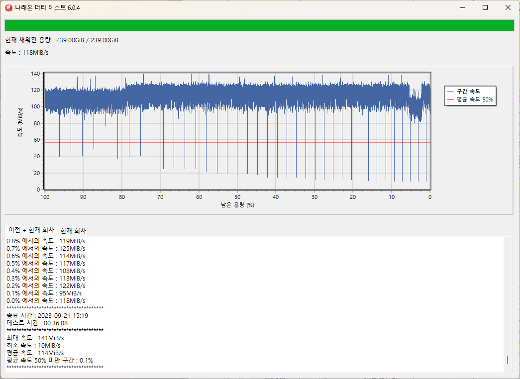 나래온 더티 테스트에서도 256GB를 다 채우는데 36분 08초가 걸렸고 평균속도는 114MB/s로 나왔습니다.