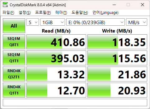제품은 가볍게 속도측정만 진행해보았으며 CDM 기준 읽기 410MB/s 쓰기 118MB/s의 좋은 속도를 보여주고 있습니다.