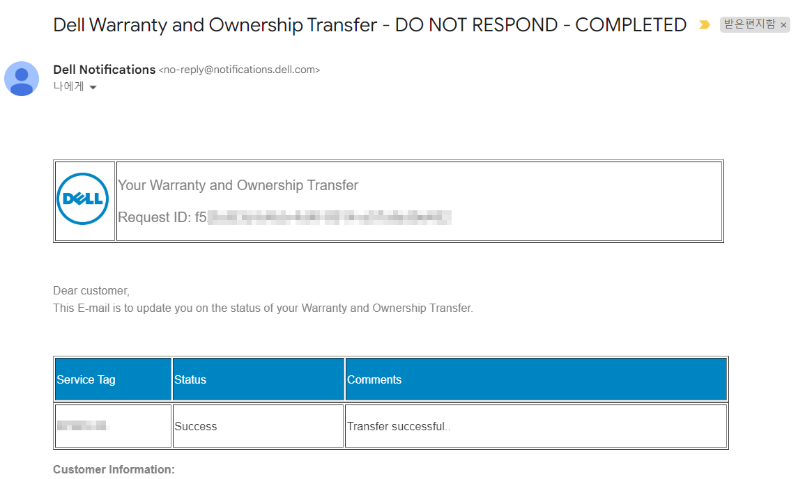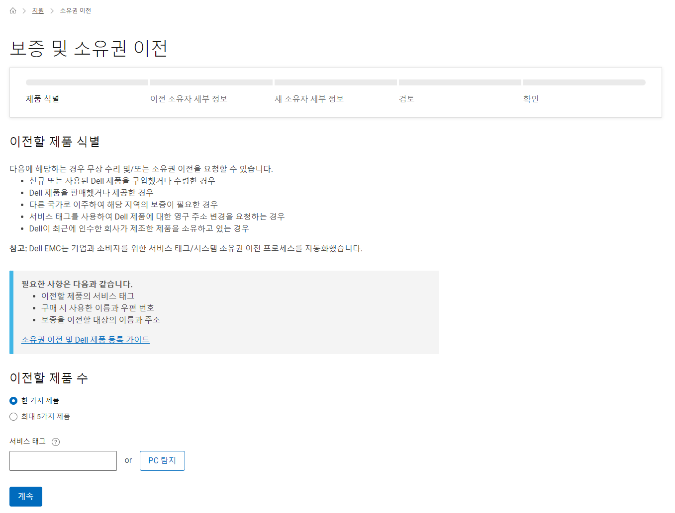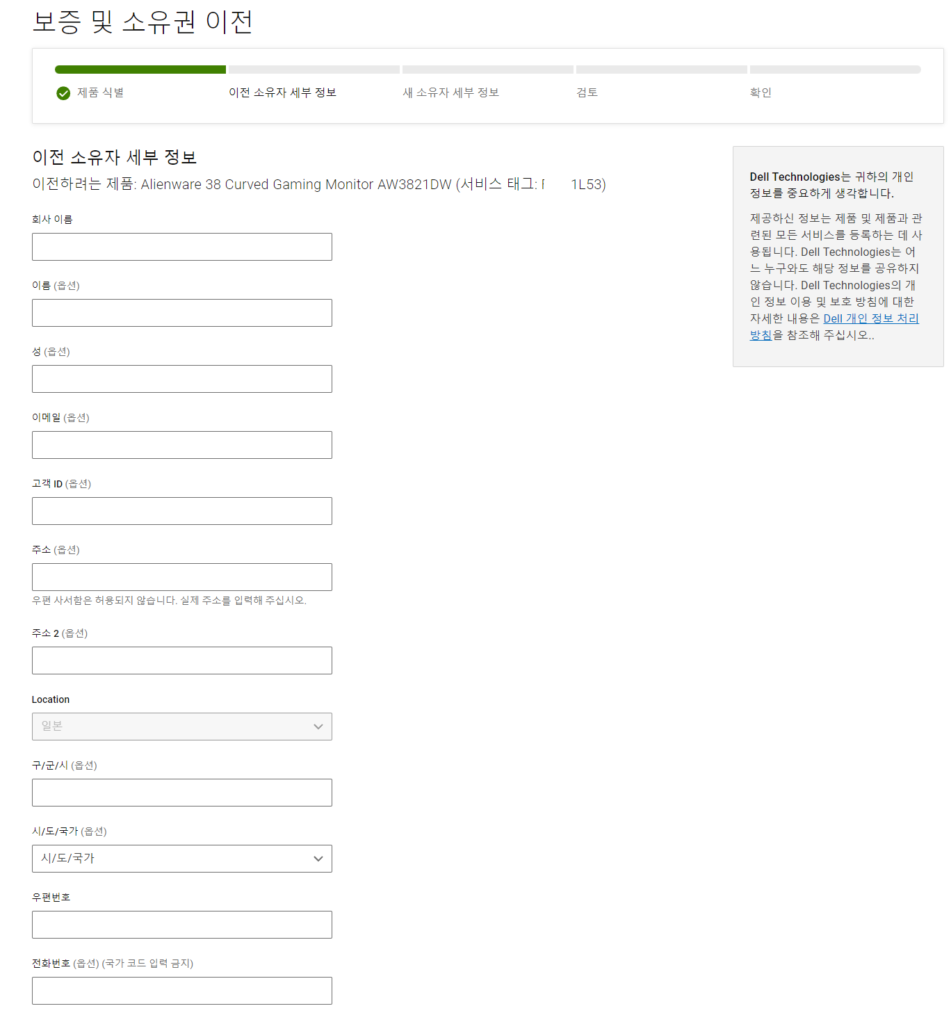 서비스 태그 조회를 통해 제품이 식별되면 이전 소유자 정보 입력이 나옵니다.