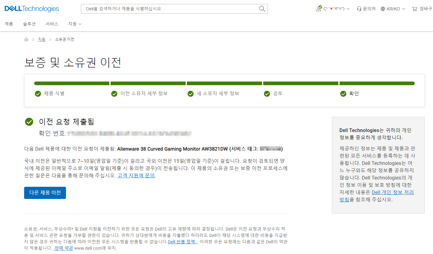 모니터 구매 이후 소유권 이전을 통해 워런티 국가를 한국으로 변경하기 위한 소유권 이전 작업을 진행했습니다.