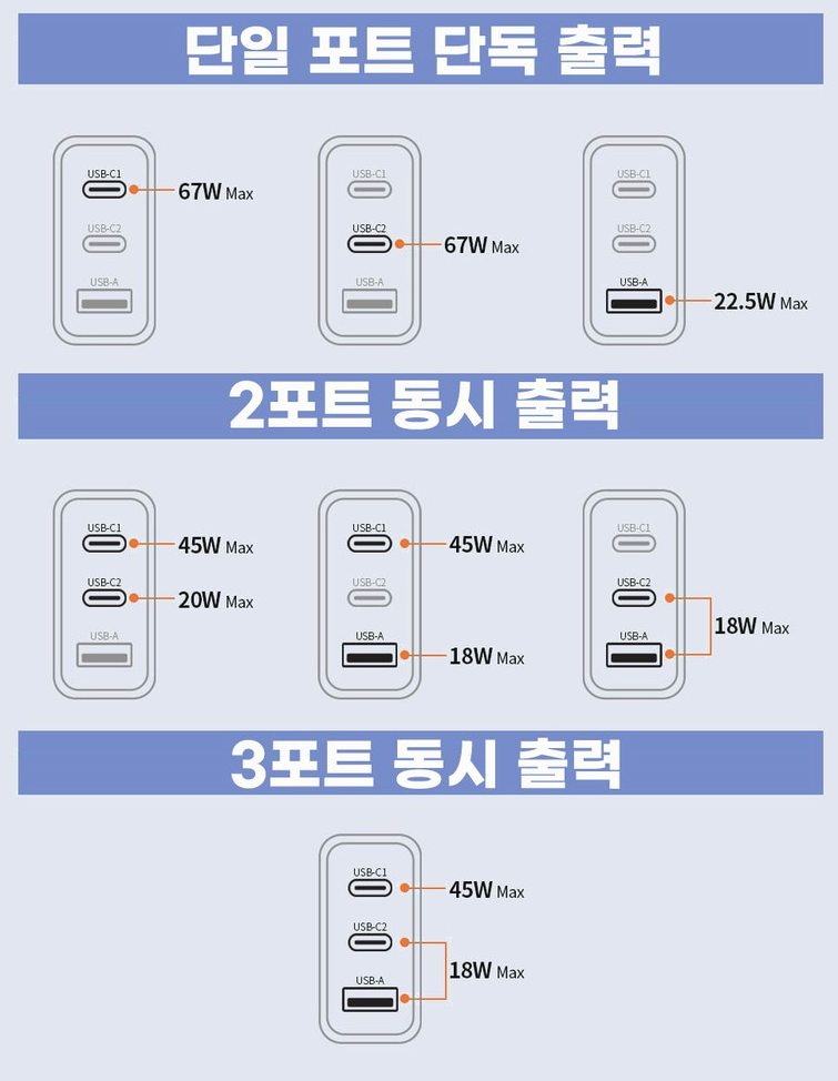 2개의 Type-C 포트와 1개의 A포트로 단독 최대 67W, 3포트 전체 63W 출력을 가지고 있는 제품입니다.
