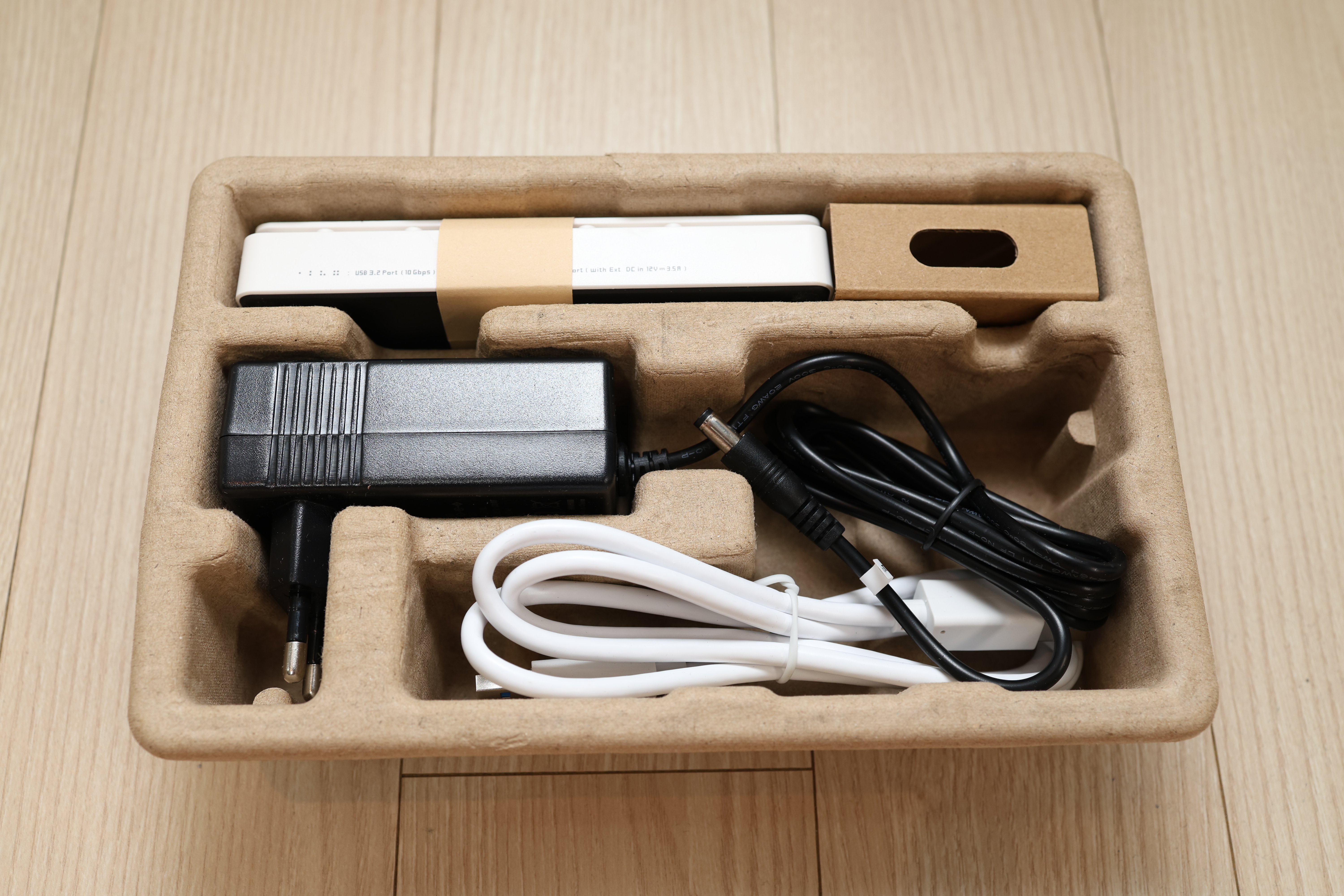 박스를 열면 내부 트레이에 제품 본체, 어댑터, USB 케이블, 설명서가 들어있습니다.