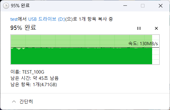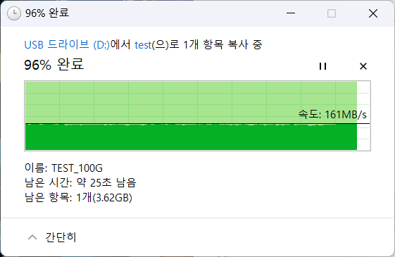 100GB 단일 파일 복사에서는 쓰기 130MB/s, 읽기 161MB/s 정도를 보여주었습니다.