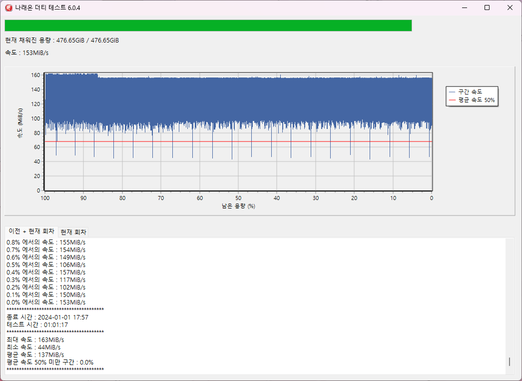 512GB를 한바퀴 돌리는데 1시간 1분 17초가 소요되었습니다.
