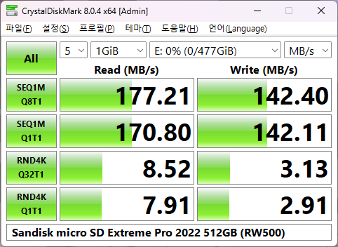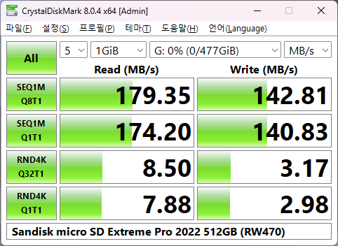 CrystalDiskMark 테스트를 통해 확인한 성능은 아래와 같으며 읽기 179MB/s, 쓰기 142MB/s 가 나오는 모습입니다.