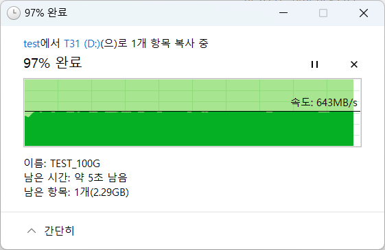 100GB 단일 파일 전송 테스트에서는 쓰기 643MB/s, 읽기 809MB/s 속도가 나왔습니다.