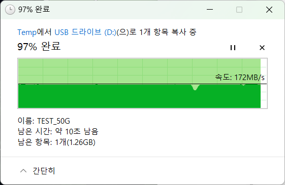 50GB 단일파일 복사 테스트에서는 172MB/s 쓰기 속도를 보여주었으나