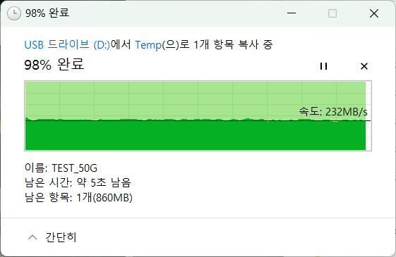 50GB 단일파일 읽기는 232-240MB/s 속도를 유지하면서 전송되었습니다.
