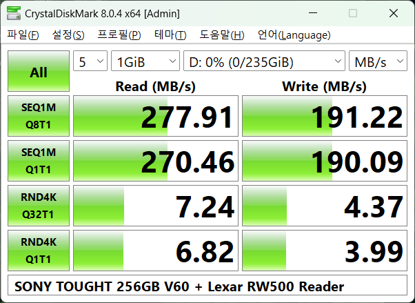 CrystalDiskMark 기준으로 쓰기 277MB/s, 쓰기 191MB/s 가 확인되었습니다.
