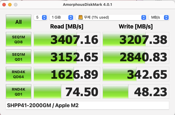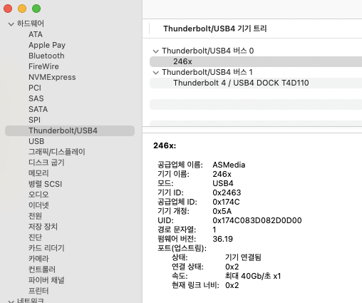 제품은 M2 맥미니에서 테스트를 진행했으며 썬더볼트/USB4 버스에 USB4 (40 Gbps)로 연결된 모습입니다.