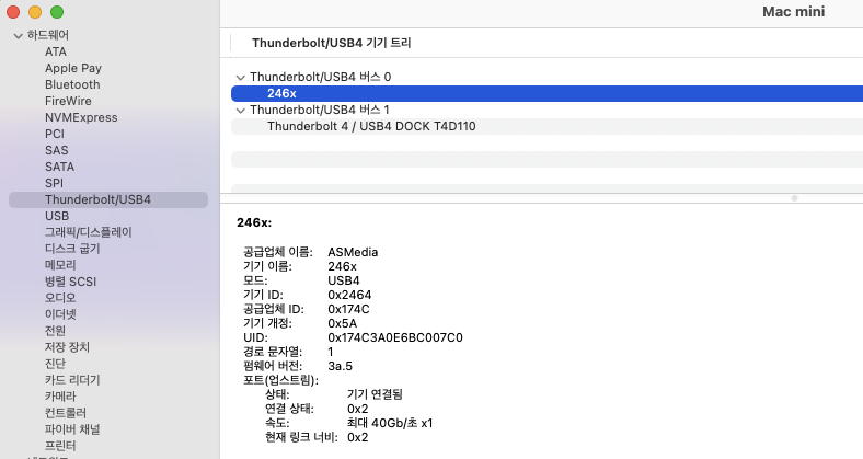 애플 M2 맥미니에 연결했을 때 USB4로 정상 인식되는 모습입니다.