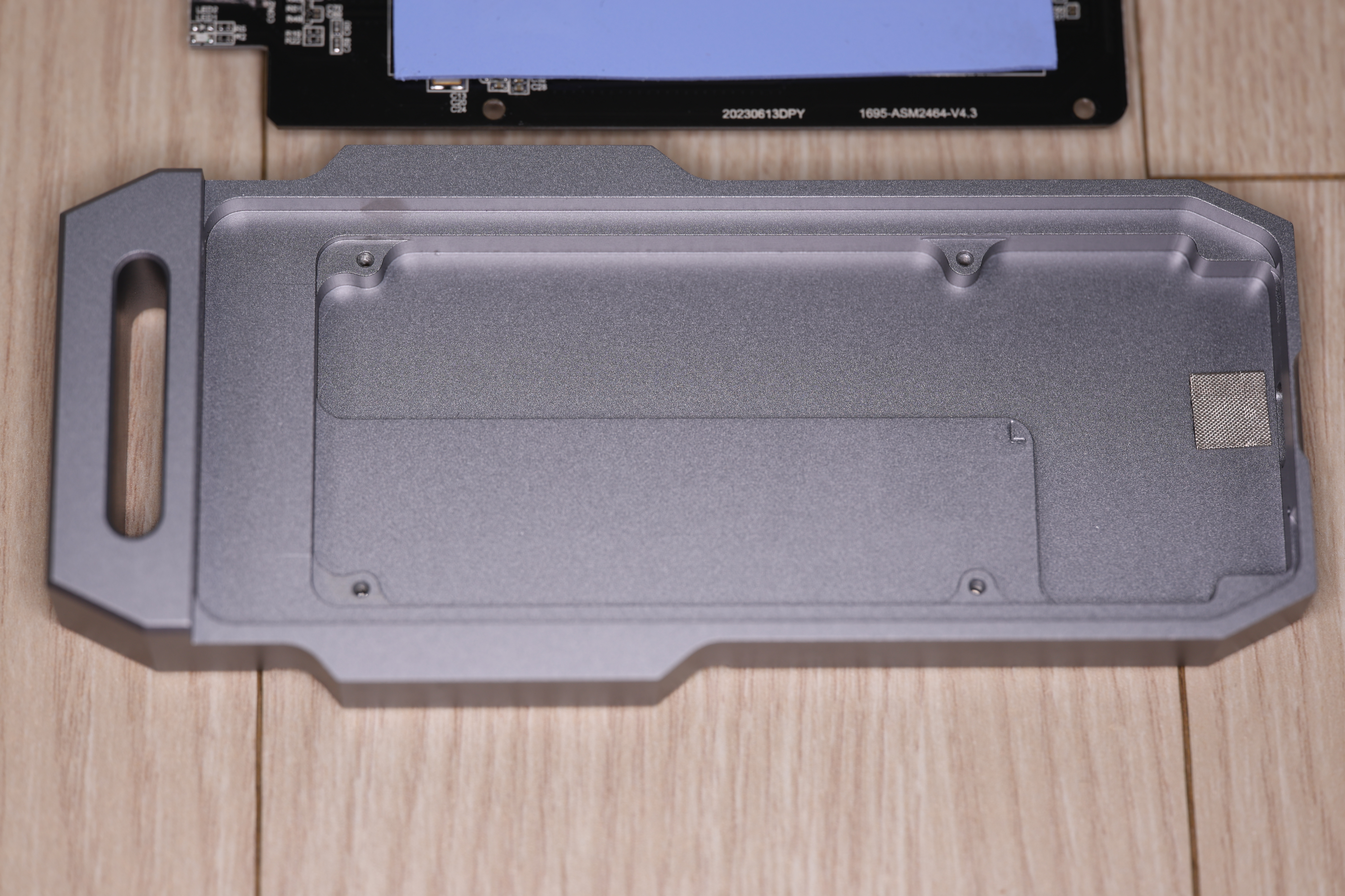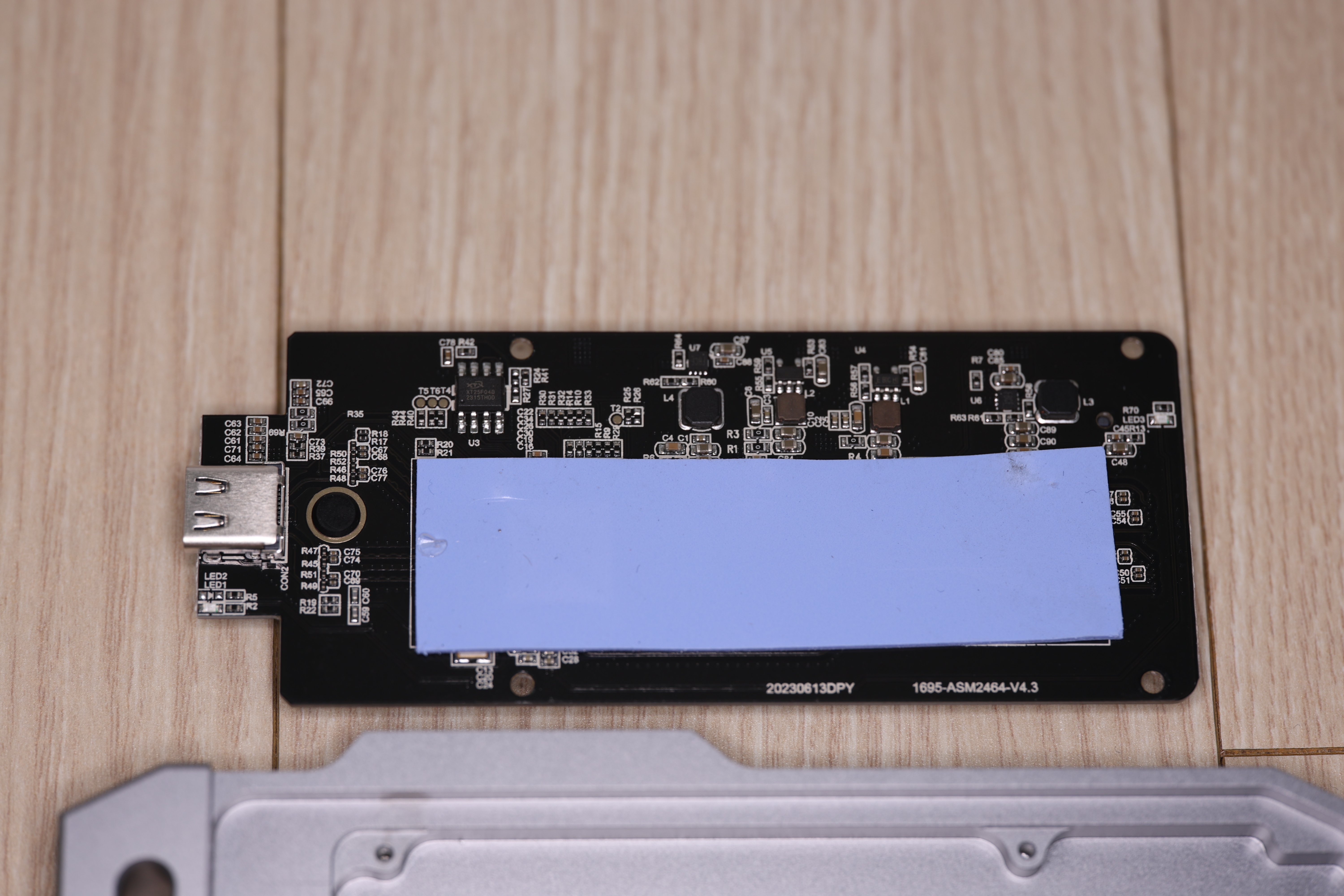 제품을 열어보면 하단부에 ASM2464PD 컨트롤러가 위치해 있으며 써멀패드로 알루미늄 프레임과 바로 연결되게 구성됩니다.