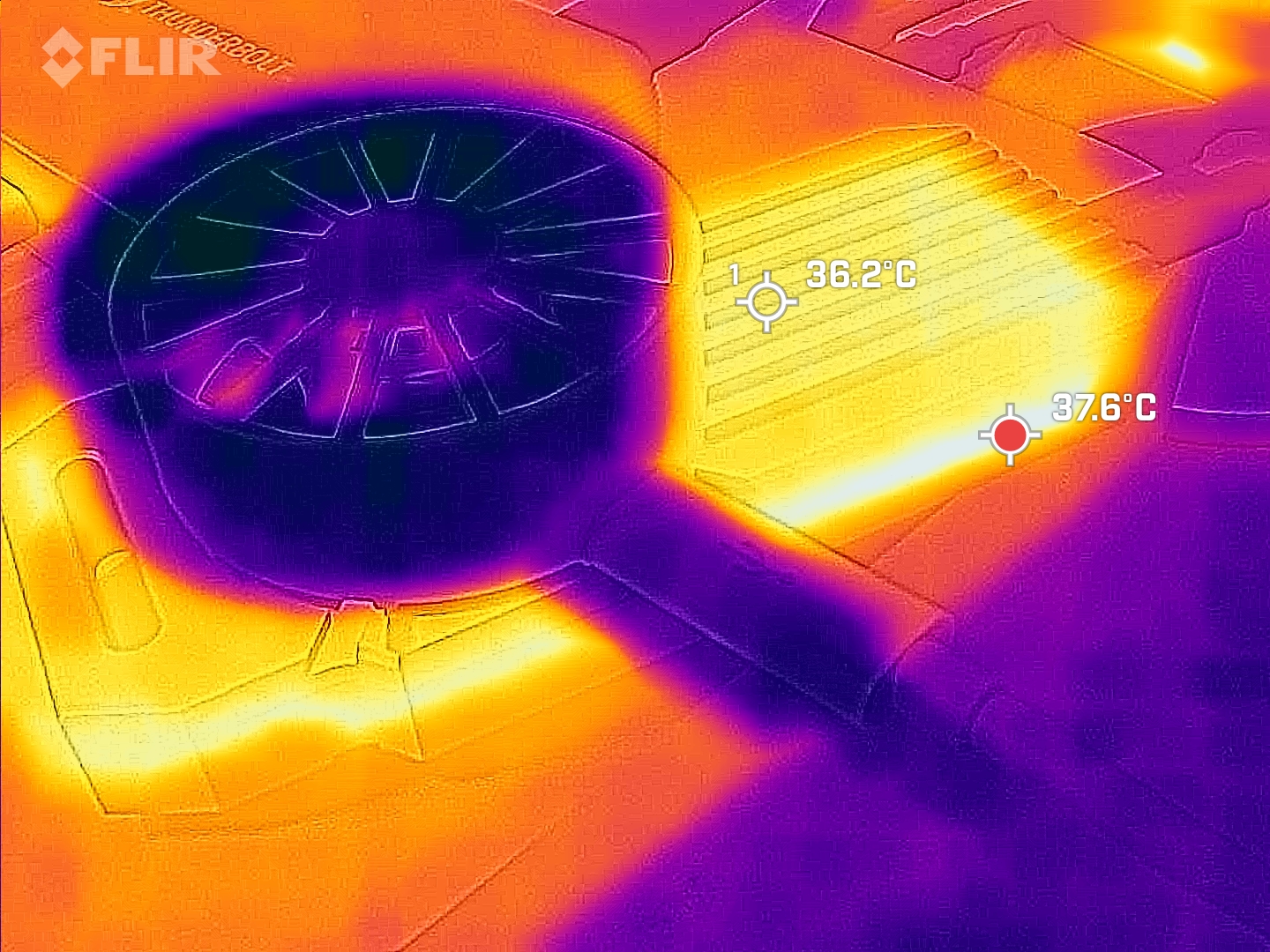 이 상황에서 동봉된 쿨러를 붙여서 이용하면 외부 온도는 36.2°C까지 떨어졌으며