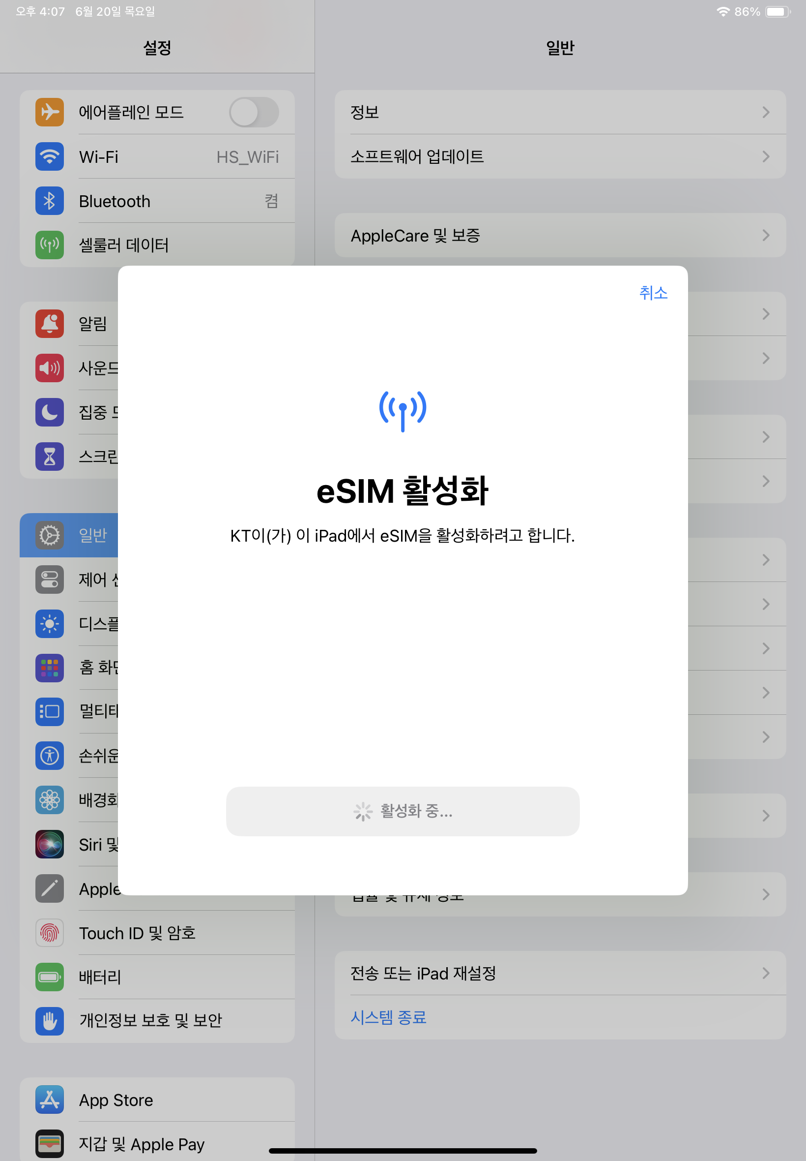 고객센터를 통해 eSIM 아이패드의 IMEI와 EID를 불러주어 기기변경(확정기변) 처리를 진행하니 정상적으로 개통되었습니다.
