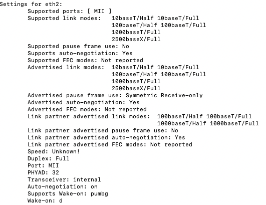 ethtool 로는 드라이버를 설치해도 2500baseX 까지만 인식되는 현상을 보이지만 실제로는 442MB/s 속도가 나오는것으로 보아