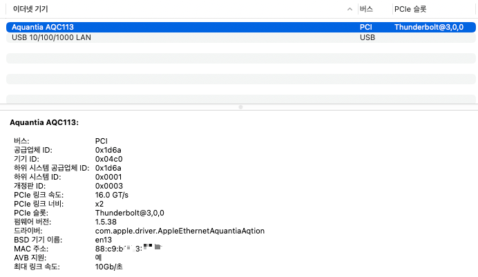 다만 USB4 컨트롤러의 하위 호환인 USB 인터페이스 (3.2, 3.1, 2.0)에서는 인식은 되나 AQC113 드라이버가 올라오지 않았습니다.