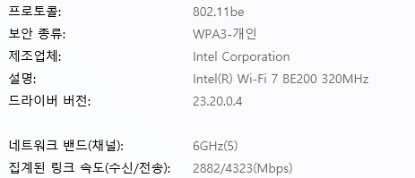 다만 인터넷에서 구할 수 있는 23.20.4 드라이버를 설치하면 802.11be로 연결은 되긴 하네요...