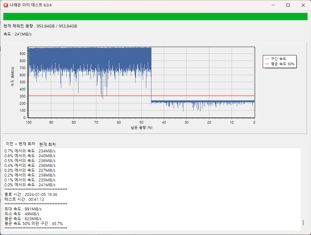 제품 더티 테스트는 아래와 같이 초반 900MB/s대 쓰기 속도에서 240MB/s 속도로 내려가게 되는데