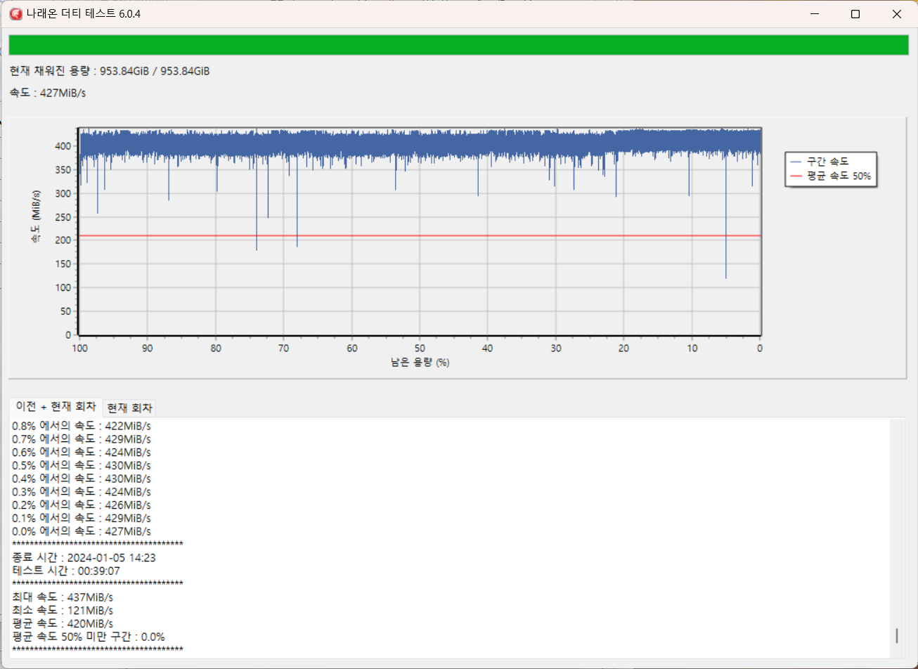 아래는 USB 3.2 Gen1 (5 Gbps) 포트에 연결하여 테스트한 결과 평균 420MB/s 쓰기 속도가 나왔으며