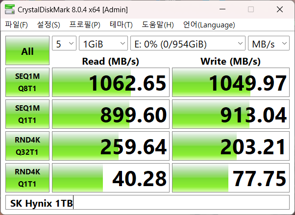 CrystalDiskMark 8.0.4 테스트에서는 순차 읽기/쓰기 모두 제품 설명과 일치하게 1000MB/s 정도로