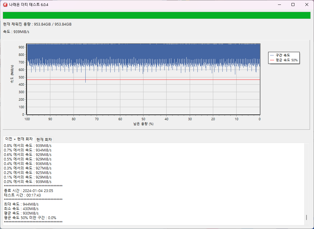 처음부터 액티브 쿨링(외부 선풍기)를 사용하여 쿨링시 평균 930MB/s 쓰기 속도가 나오는 모습입니다.